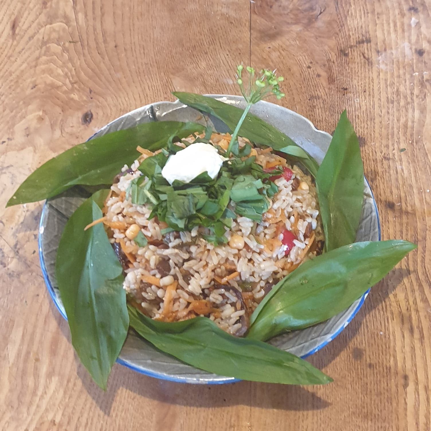 Here’s how…. First rinse the rice and place in a pan with the buckwheat and a dash of salt. Now cover with 1/2 inch (1.5cm) of water and boil until the rice is softish but a little nutty (to your taste). Keep an eye on it and add more boiling water if needed. Take off the heat and strain if necessary, then leave to cool. Place sweet potato and pepper in a baking tray with some olive oil and black pepper and put in a hottish oven. Bake for 10 mins or until they begin to soften and add diced mushrooms. Bake for another 10 mins or so (depending on your oven – keep an eye on this too). Grate the carrots and chop wild garlic fairly roughly. Stir all the ingredients, including the spices, together gently with some salt and pepper leaving a handful of wild garlic to go on top. Whisk the tablespoons of oil and vinigar together with salt and pepper and perhaps a little mustard, if you want then, stir into the salad to taste. Finally, spoon it all nicely onto a plate, decorate with left over wild garlic flowers/leaf and its done!