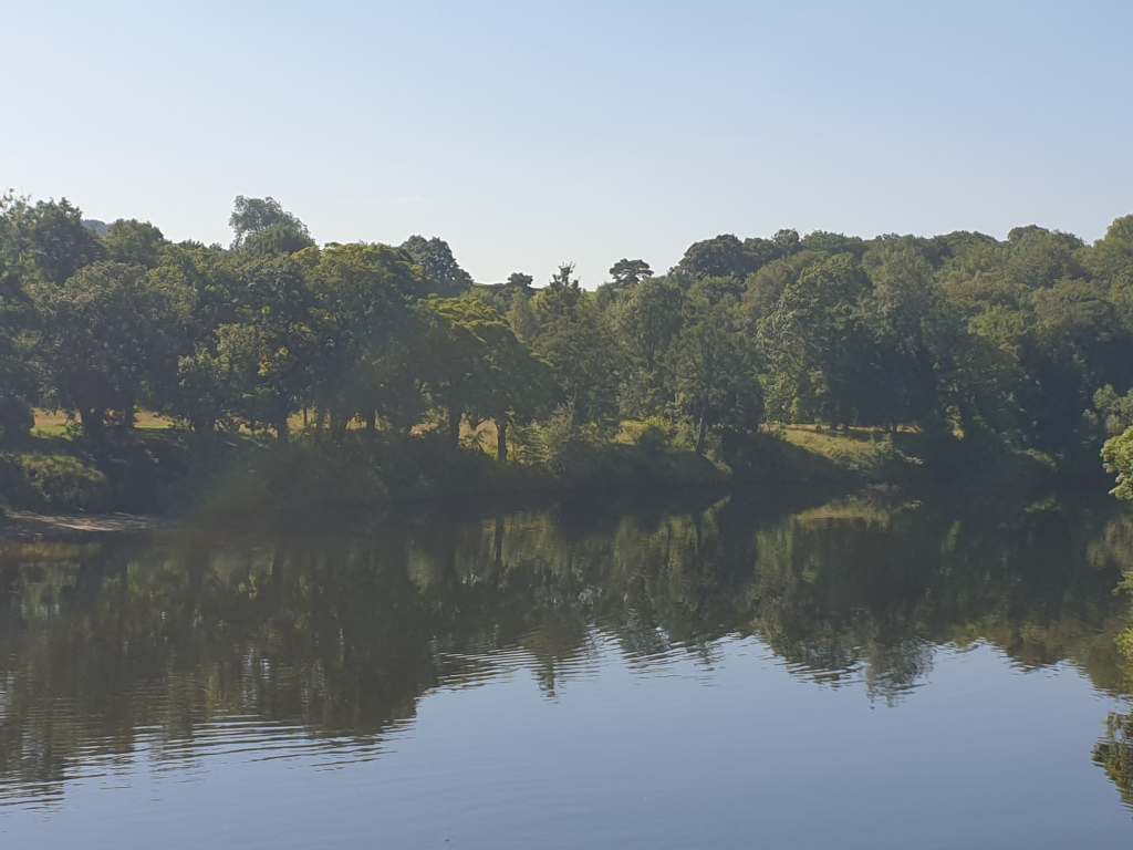 South from here there are some great swims passing woods on one side and a series of grand houses and the military training camp on the other as well as some rest or exit points. A lot of people swim to the motorway bridges. The first one has multiple echoes so have a little sing and listen! These are 800m away so just more than a mile in total there and back. Continuing south you need to pass through the centre of the next bridge span as it is very shallow on either side. I tend to stick to the western shore between Denny Beck and the motorway bridge. After that I cross the to the east side as far as aqueduct and the jetty as there are more exit points in case of problems arising, although there are some dead trees in the water in some places, so you need to be careful. Beyond the jetty, but well before the weir, I cross to be able to make landfall on the west side of Skerton Bridge where there is some decking to get out on.