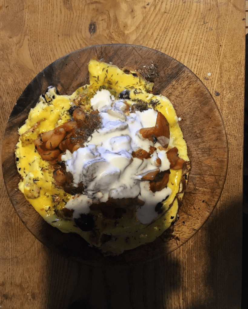 TOFU OMELETTE WITH HOMEMADE GARLIC SWEET POTATO AND MUSHROOM BAKED BEANS